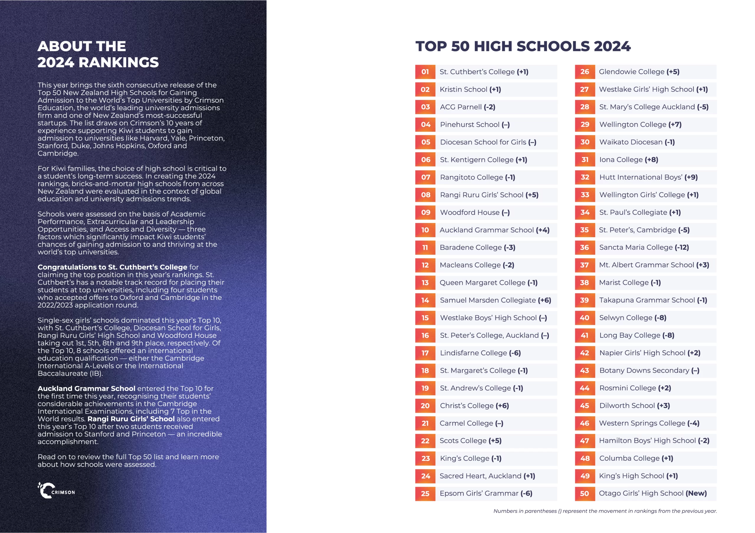 แต่ละปี Crimson Education Group จะประกาศชื่อโรงเรียน 50 อันดับแรกของนิวซีแลนด์ โดยพิจารณาจากผลสอบ NCEA ผลการเข้าเรียนต่อในมหาวิทยาลัย และจำนวนทุนการศึกษาจากรัฐบาลที่นักเรียนแต่ละโรงเรียนได้โดยเริ่มจัดอันดับในปี 2019 จนถึงปีปัจจุบัน